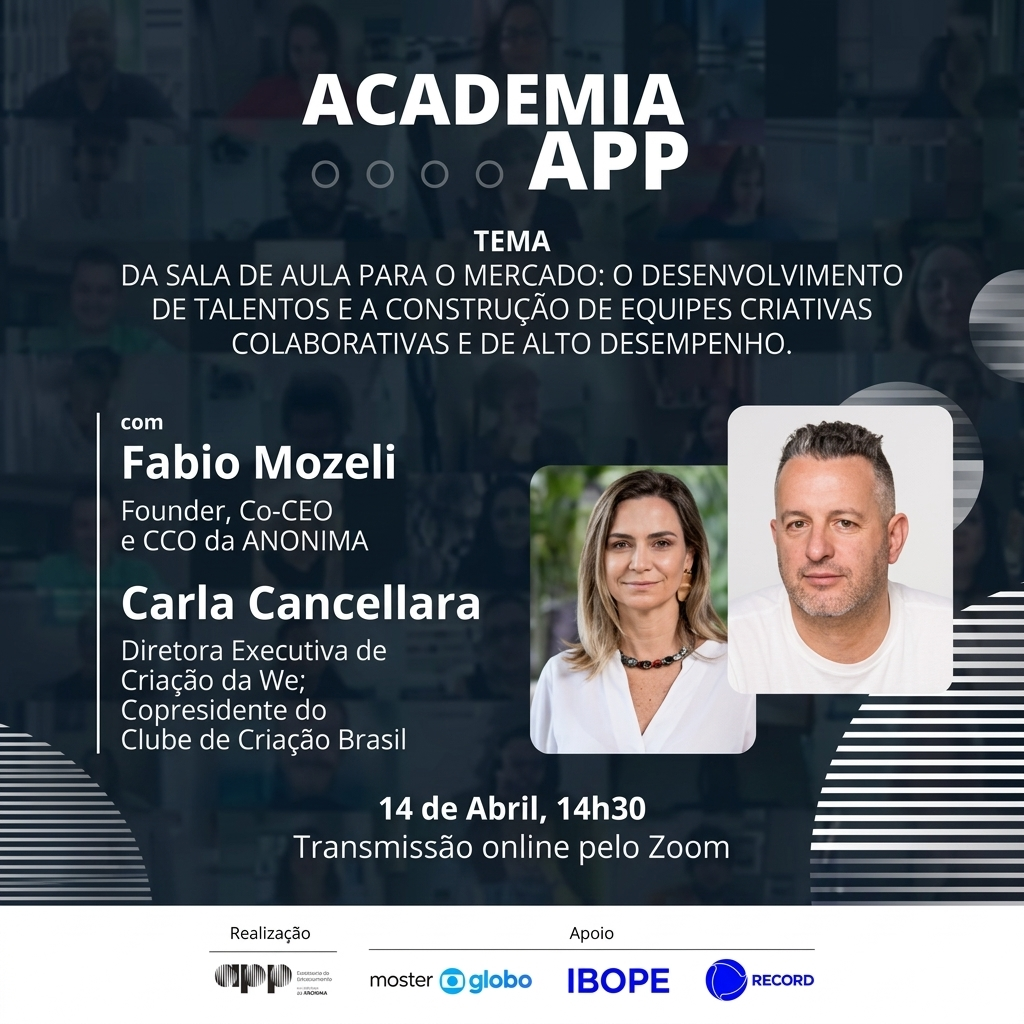 A APP Brasil realiza mais uma edição da Academia APP, um evento gratuito e online voltado para professores e coordenadores da área de comunicação. A ideia é promover discussões sobre temas atuais do mercado publicitário brasileiro, incentivando a troca de informações e aproximando o ambiente acadêmico das dinâmicas das agências, contribuindo para a atualização e o desenvolvimento desses profissionais.
